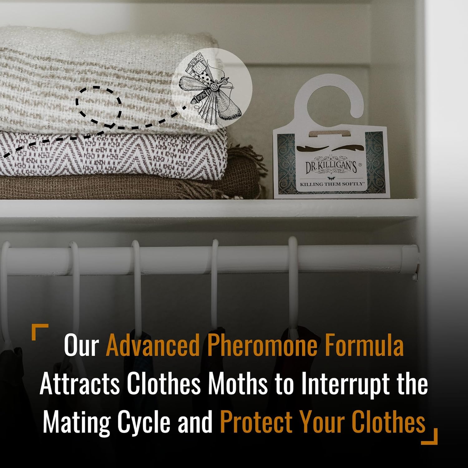 - Organic Solution With Killer Results — Get closet moth protection for your Wool, Cashmere, Fur, Feathers, Carpet and more with Dr. Killigan’s people and pet-friendly moth traps. Our Advanced Formula mixes double-potent pheromones and the stickiest glue to lure and capture ALL adult male clothes moths, and end the reproduction cycle. The complementary design maximizes air flow and increases effectiveness.