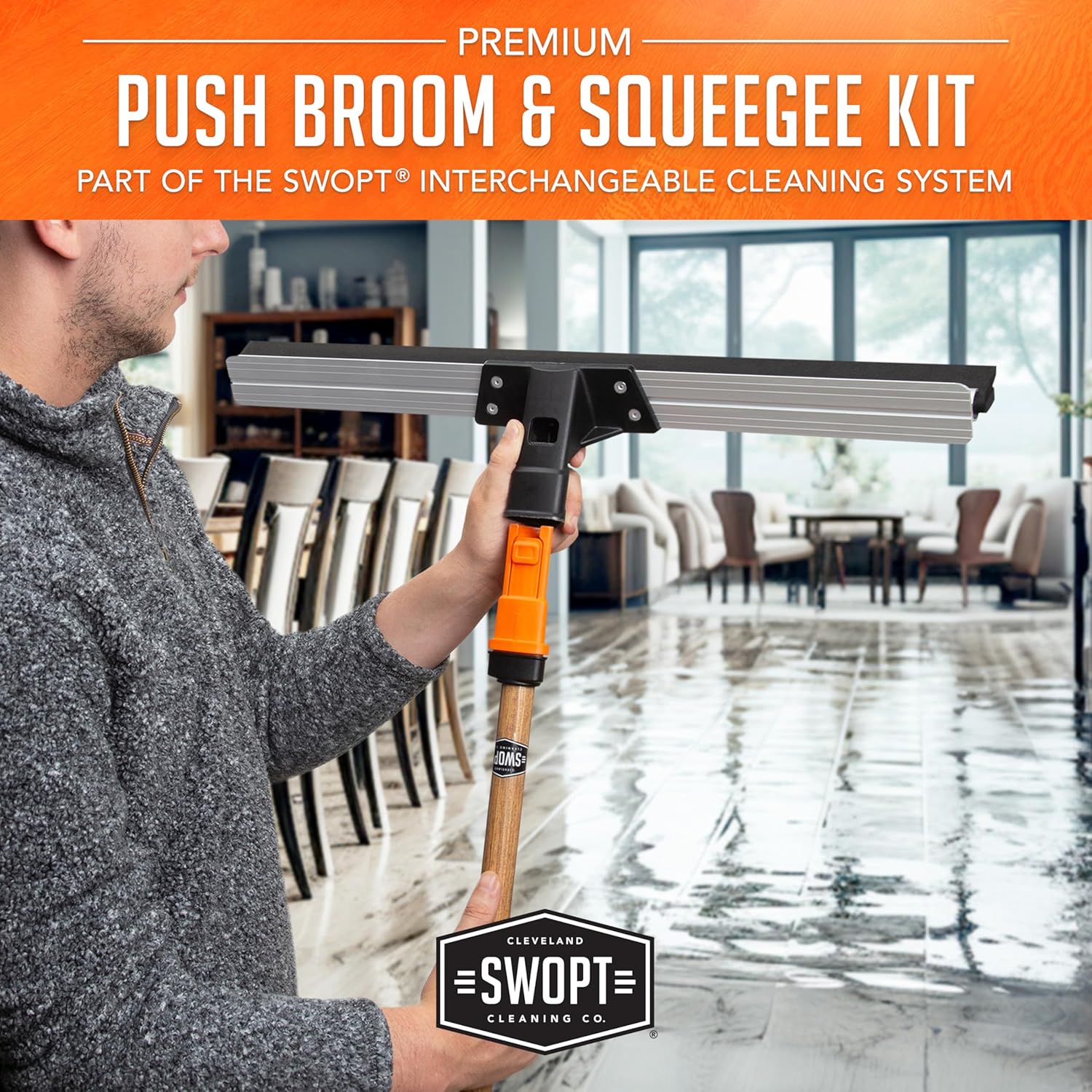SWOPT 24” Floor Squeegee, 24” Multi-Surface Push Broom + 60" EVA Foam Comfort Grip Wooden Handle, Combo — 2 Cleaning Heads with Long Handle Interchangeable with SWOPT Cleaning Heads