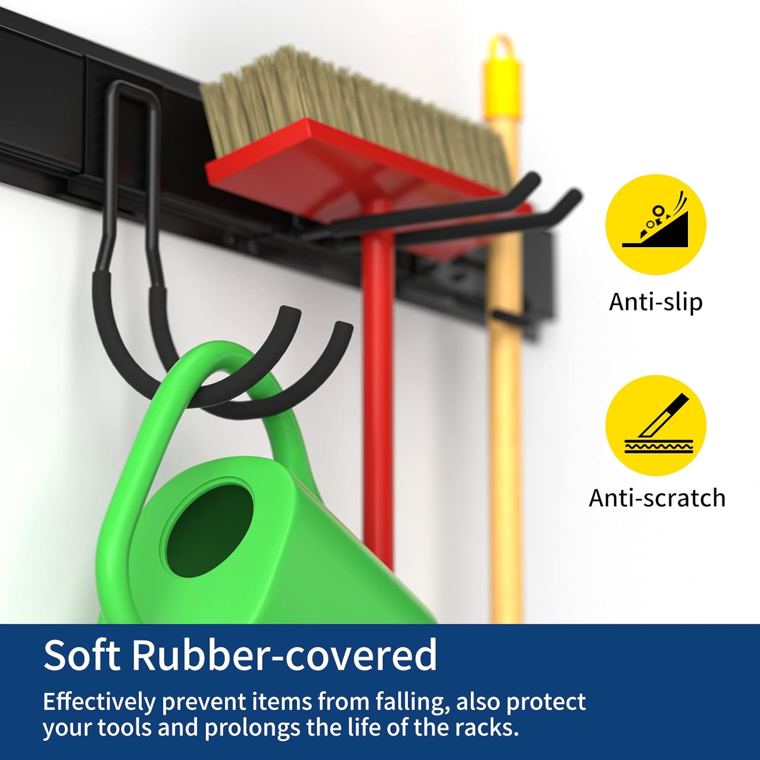 - 【Adjustable Rubber-coated Hooks】- The garage organizers and storage have 2 double layer hooks, 3 long hooks, 2 large J hooks, 2 broom hooks and and 2 extension straps are designed to fit all your needs. All the hooks wrapped in rubber to protect your tools from sliding and getting damaged.