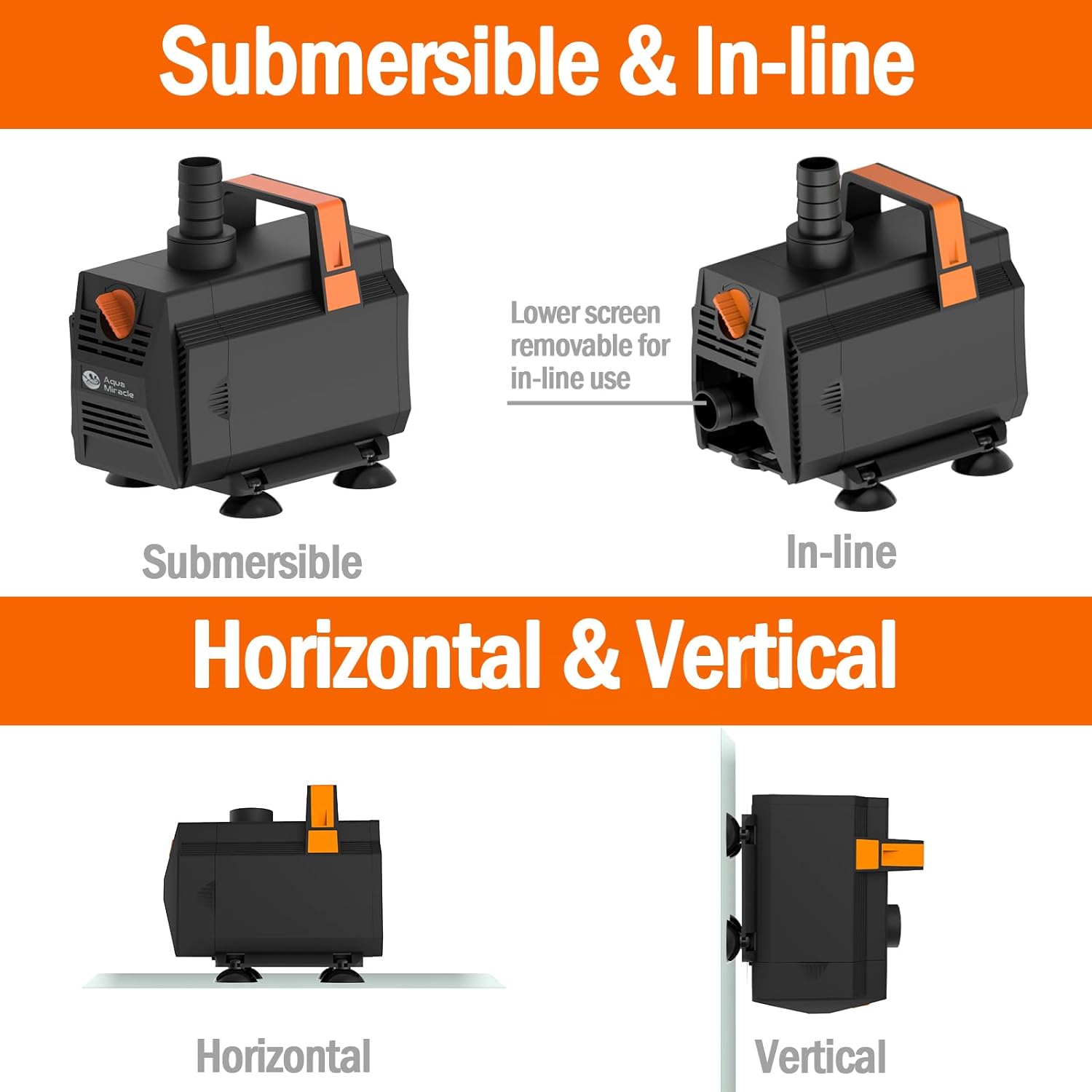 - AMPHIBIOUS – This pond pump can be used both in and out of water. The front inlet screen is easily removable for connecting to the inlet hose.