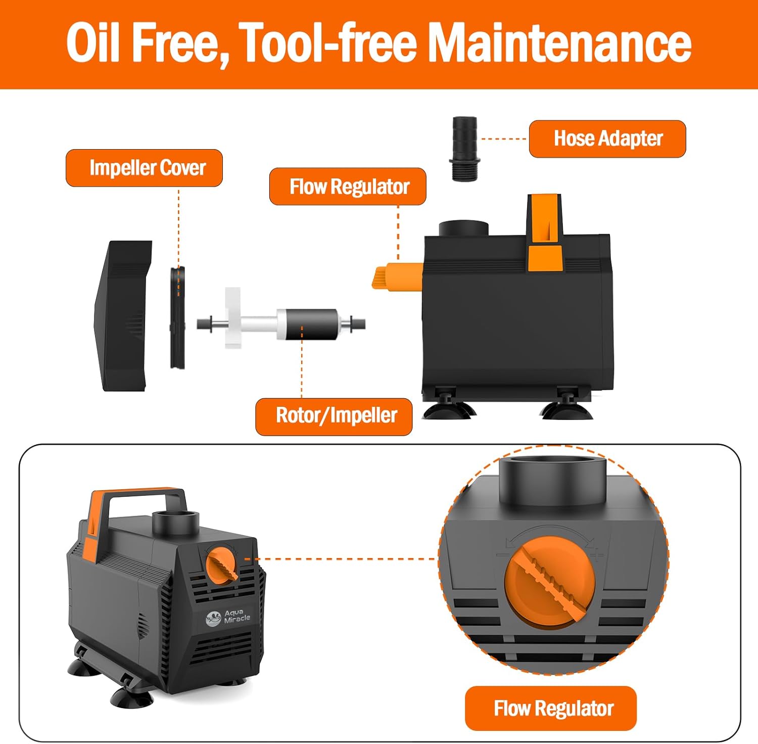 - HANDY AND EASY TO MAINTAIN – 1. This fountain pump is designed with a handle for ease of carry. 2. Lubricant free and no special tool is needed for maintenance. Simply pull to detach the front screen from the submersible water pump and rinse the components with water.