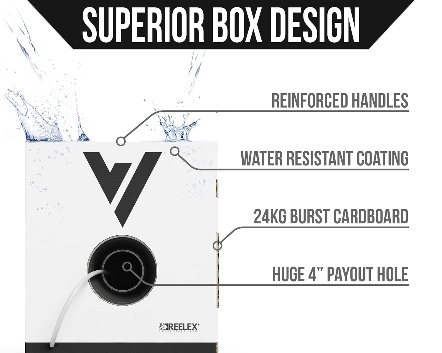 - TIME SAVING FEATURES. Patented winding technology & massive payout hole eliminate kinks and tangles. Reinforced handles, super-durable cardboard, & water resistant coating keep the box intact. Jacket features ripcord, UL information, re-order part number, and foot markers.
