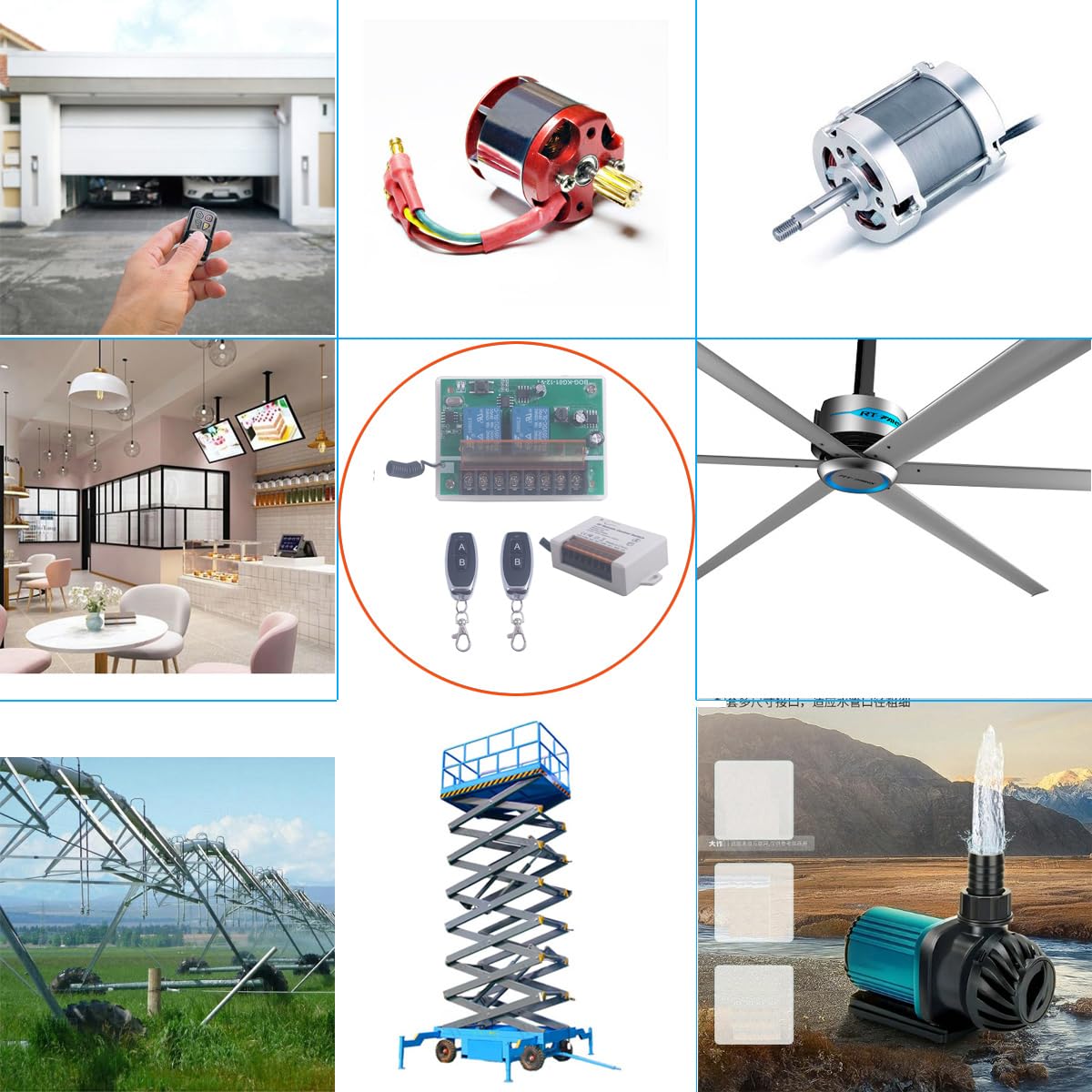 - đă wide applications rangeăThe remote switches are used in industrial homes, farms, factories, offices, laboratories, supermarkets fields etc. Other applications, such as wireless monitoring equipment, Power switch, small motor, buzzer, electromagnets, light, electronic power supply equipmentďź, Motors, Fans, Cameras, Video signals, Audio signals, electrically operated Doors/ Locks/ Windows, ventilation devices, signal transmission.
