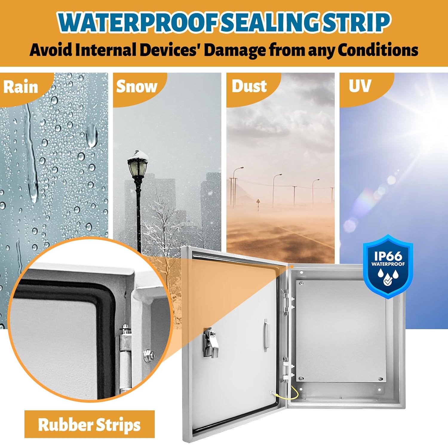 - The electrical junction box is made of thickened sealing strip with one-time molding technology, which can effectively prevent dust and ultraviolet light and protect the internal circuit. The electrical box reaches IP66 waterproof level, which can effectively prevent the corrosion of natural weather.