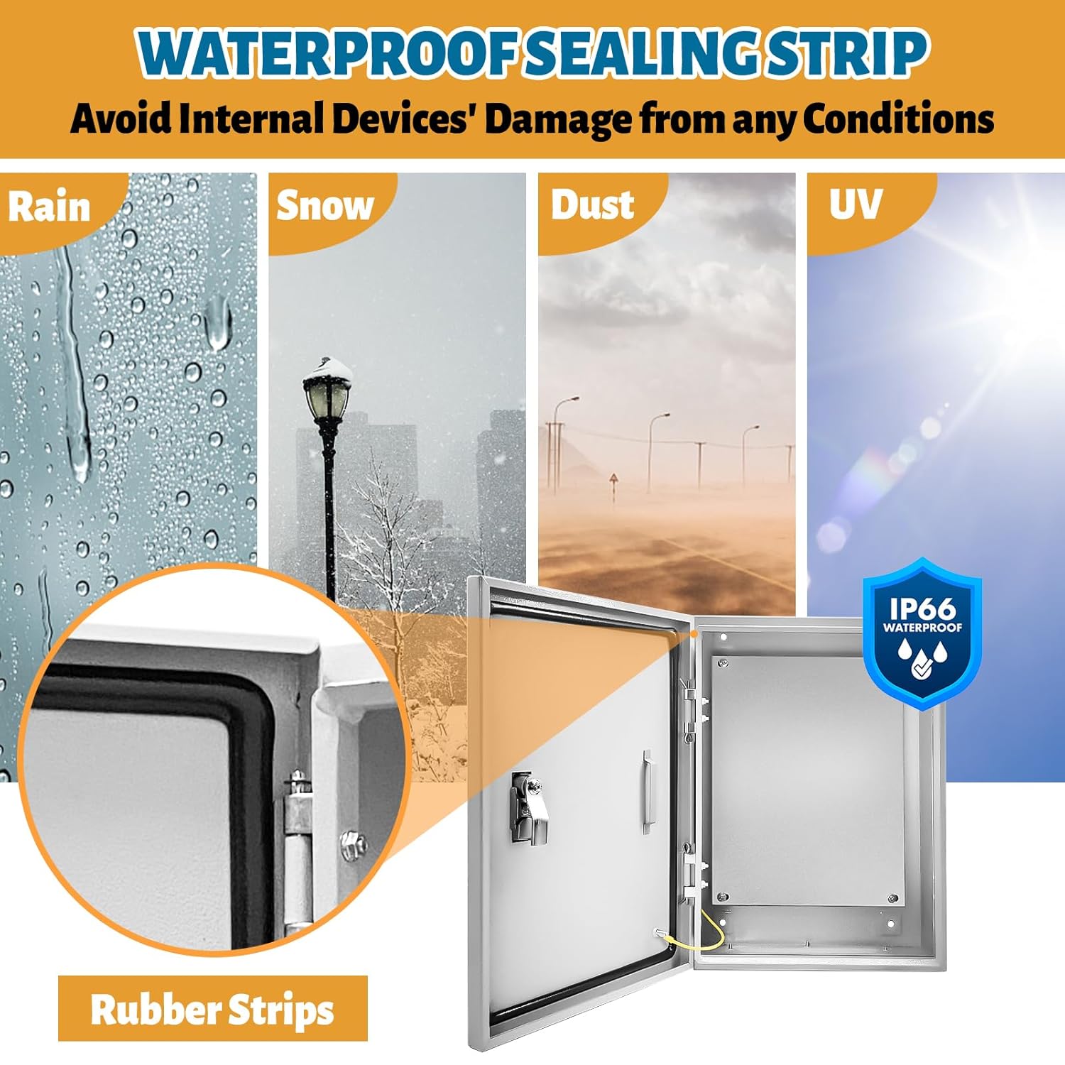 - The electrical junction box is made of thickened sealing strip with one-time molding technology, which can effectively prevent dust and ultraviolet light and protect the internal circuit. The electrical box reaches IP66 waterproof level, which can effectively prevent the corrosion of natural weather.