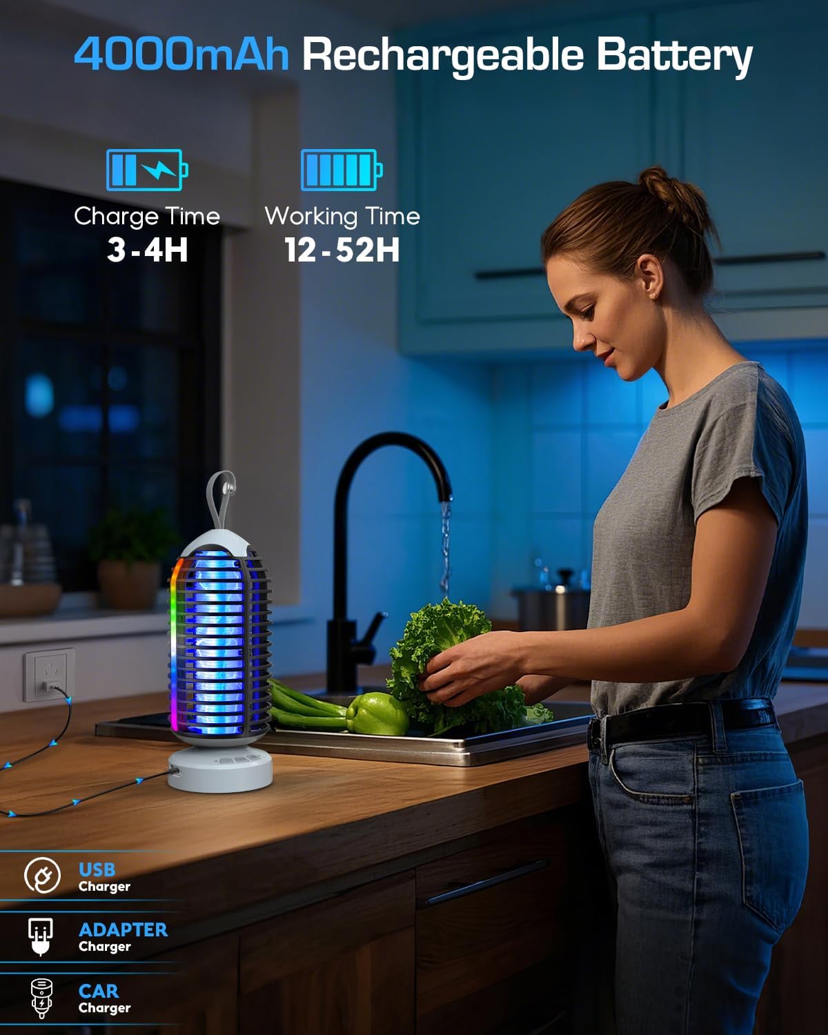 - 4000mAh Rechargeable Battery: This indoor fly zapper features a high-capacity 4000mAh battery, offering extended runtime: 12–16 hours in mosquito light mode, 7–18 hours in night light mode, and 17–52 hours in ambient light mode.With quick USB-C charging, it takes just 3-4 hours to fully recharge. Enjoy the freedom of cordless operation—whether at home or on the go, its portable, cordless design ensures continuous mosquito protection, letting you sleep peacefully without interruption.