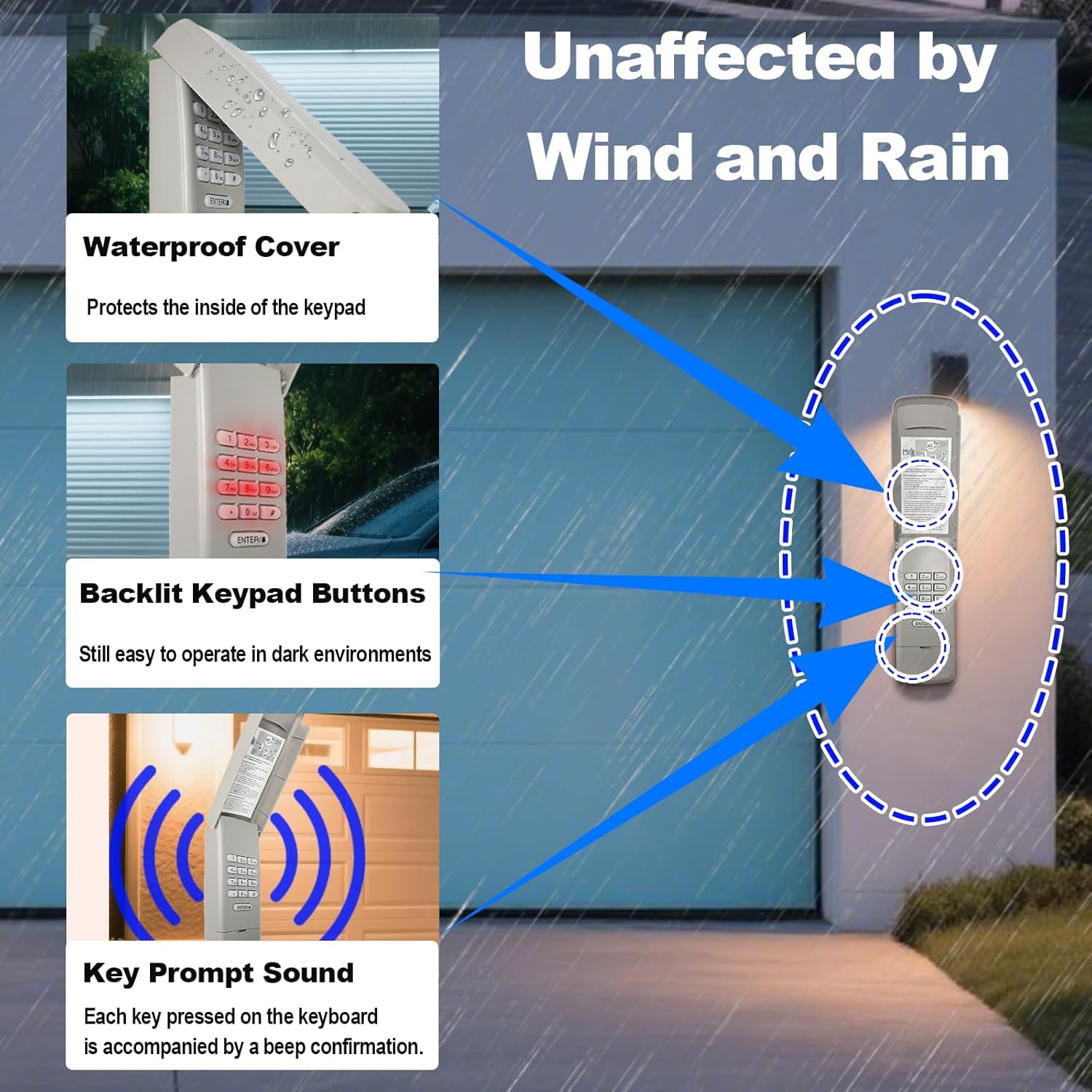 - 3.Wireless keyless keypad: Simply enter 4 PIN codes to open the garage door, reducing the hassle of forgetting to bring your keys or remote control. The keyless entry system can control up to 3 openers.