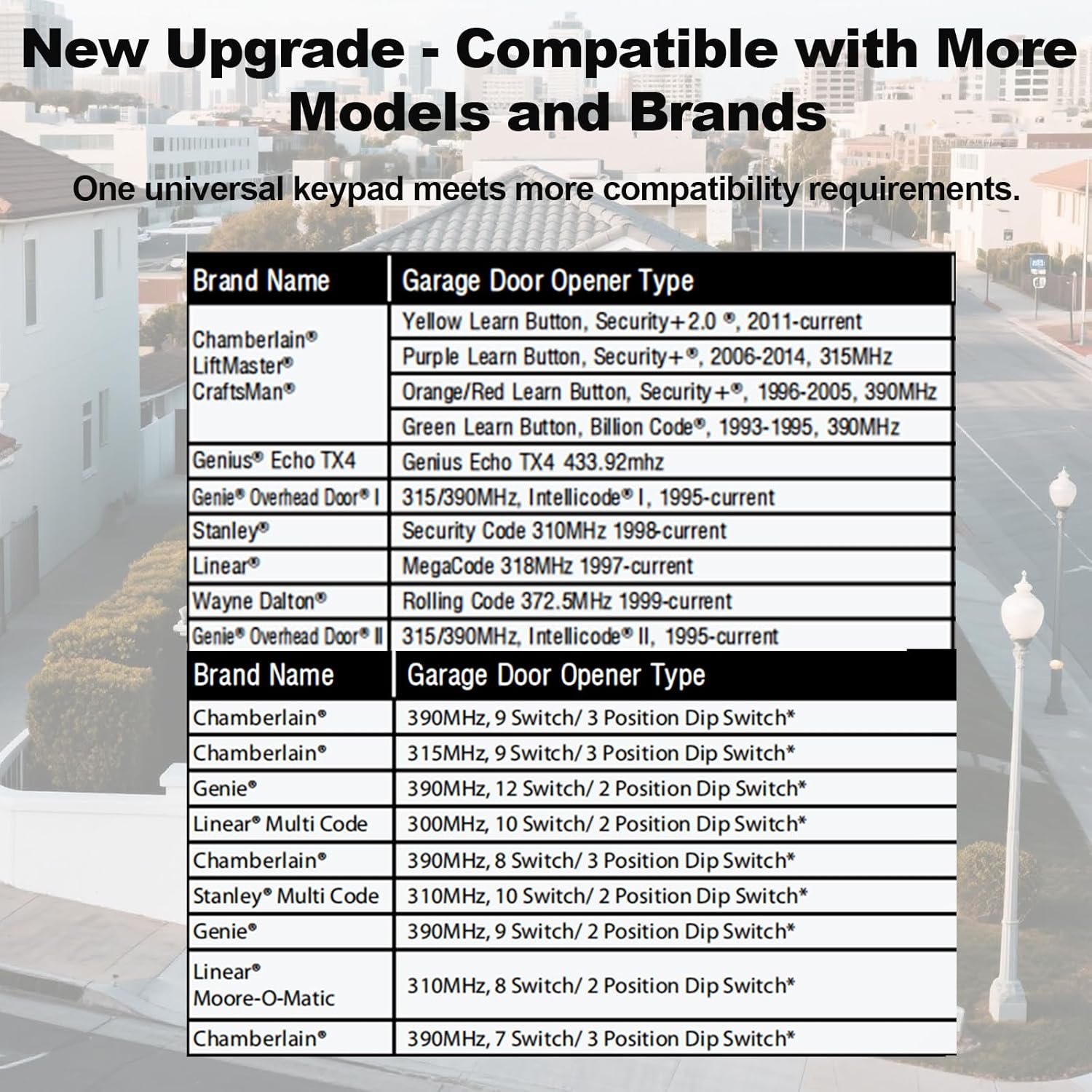- 1.Wide universal compatibility: This universal garage door opener keypad is compatible with most LiftMaster/Chamberlain/CraftsmanGenie/Linear/Wayne/Stanley/Genie Overhead Door garage door openers.Suitable for commercial door machines or other products operating at 315 MHz or 390 MHz, with yellow, purple, red, orange, and green learning buttons.Also applicable to garage door openers with dip switches.