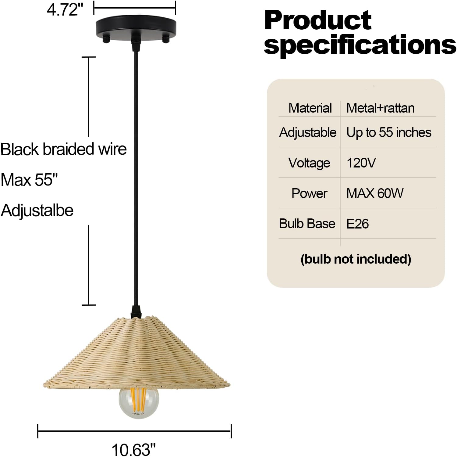 - Bulb Requirements:This hard wired boho pendant light uses a standard E26 lamp bulb, Max wattage 60W.Voltage: 110V/120V.Accommodates dimmable LED bulb, Edison bulb,or Incandescent, Halogen bulb. Note: bulbs are not included.
