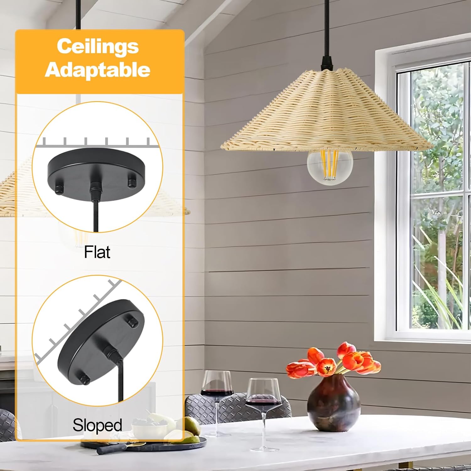 - Versatile Rattan Pendant Light for Multi-Room Use:From kitchen island illumination to bedroom hanging lamps, this rattan pendant lamp adapts to any space,such as living room, dining room, kitchen, farmhouse, reading room, hallway, stairwell, and other places. Can be installed on different ceilings, including flat, sloped and vaulted ceilings.