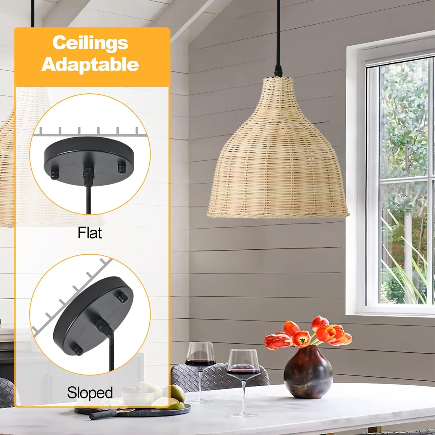 - Versatile Rattan Pendant Light for Multi-Room Use:From kitchen island illumination to bedroom hanging lamps, this rattan pendant lamp adapts to any space,such as living room, dining room, kitchen, farmhouse, reading room, hallway, stairwell, and other places. Can be installed on different ceilings, including flat, sloped and vaulted ceilings.