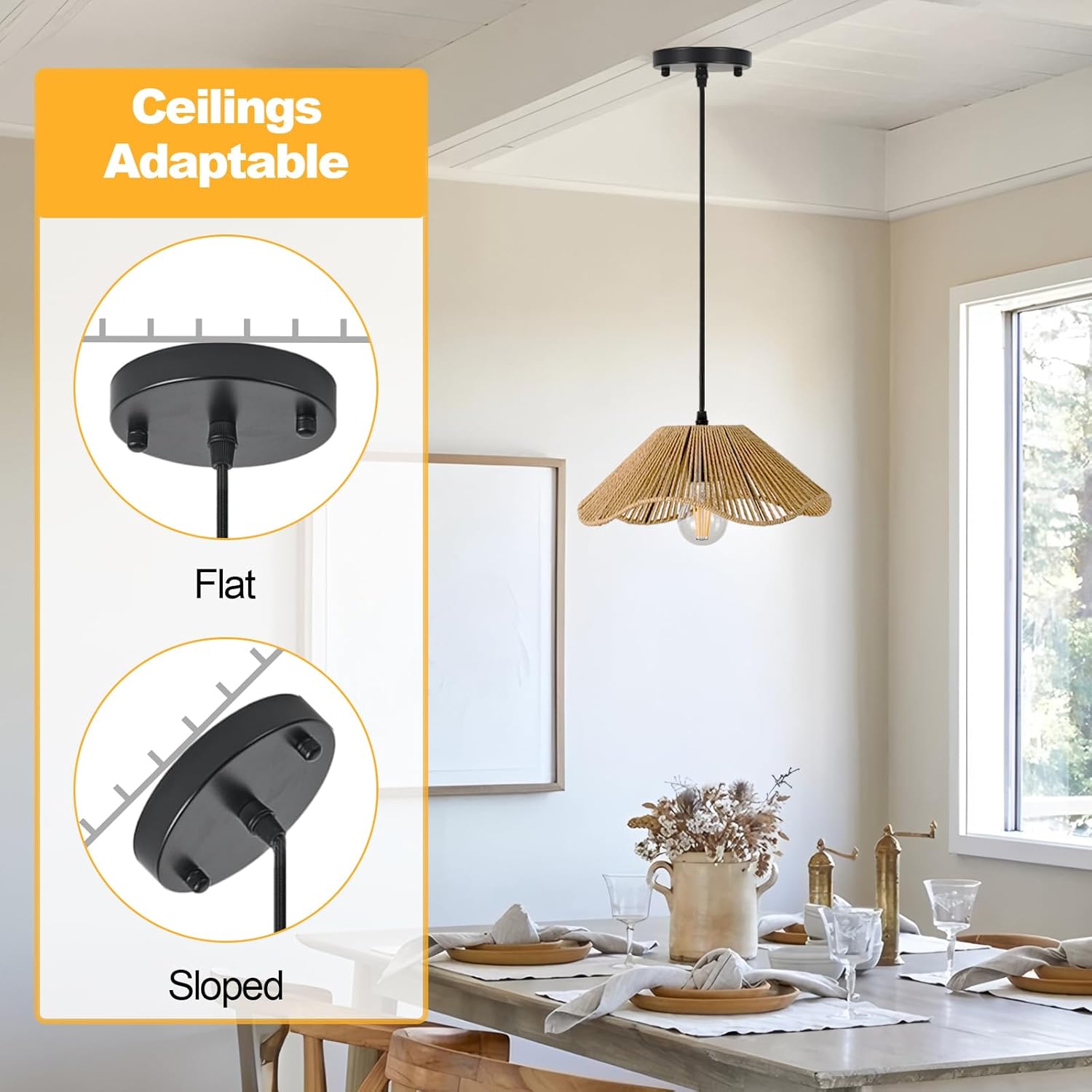 - Versatile Rattan Pendant Light for Multi-Room Use:From kitchen island illumination to bedroom hanging lamps, this rattan pendant lamp adapts to any space,such as living room, dining room, kitchen, farmhouse, reading room, hallway, stairwell, and other places. Can be installed on different ceilings, including flat, sloped and vaulted ceilings.