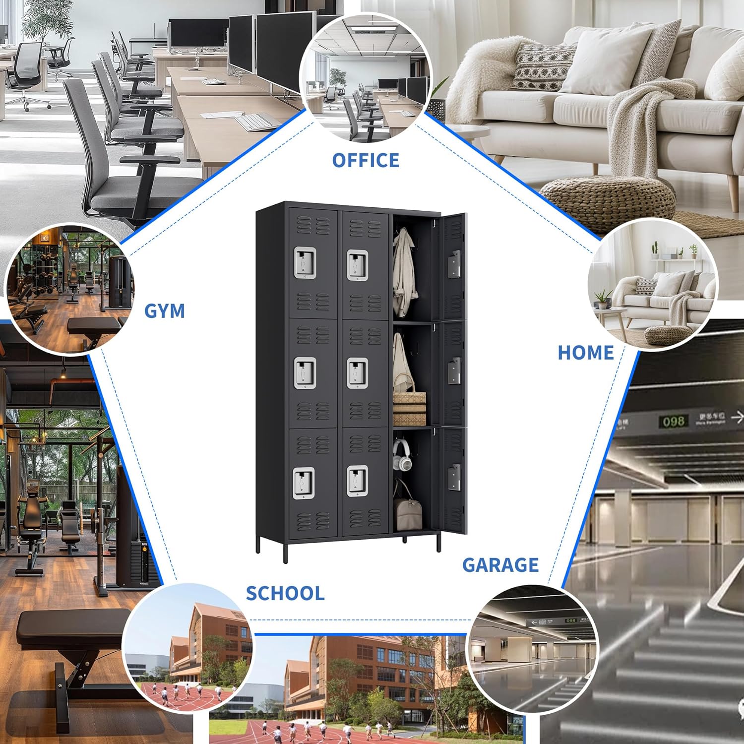 - LARGE STORAGE CAPACITY - The 9 door metal locker measures 72"H x 15.7"W x 35.4"D and is equipped with 3 separate compartments. This design caters to your storage needs for items of different sizes, efficiently accommodating most of your daily storage requirements
