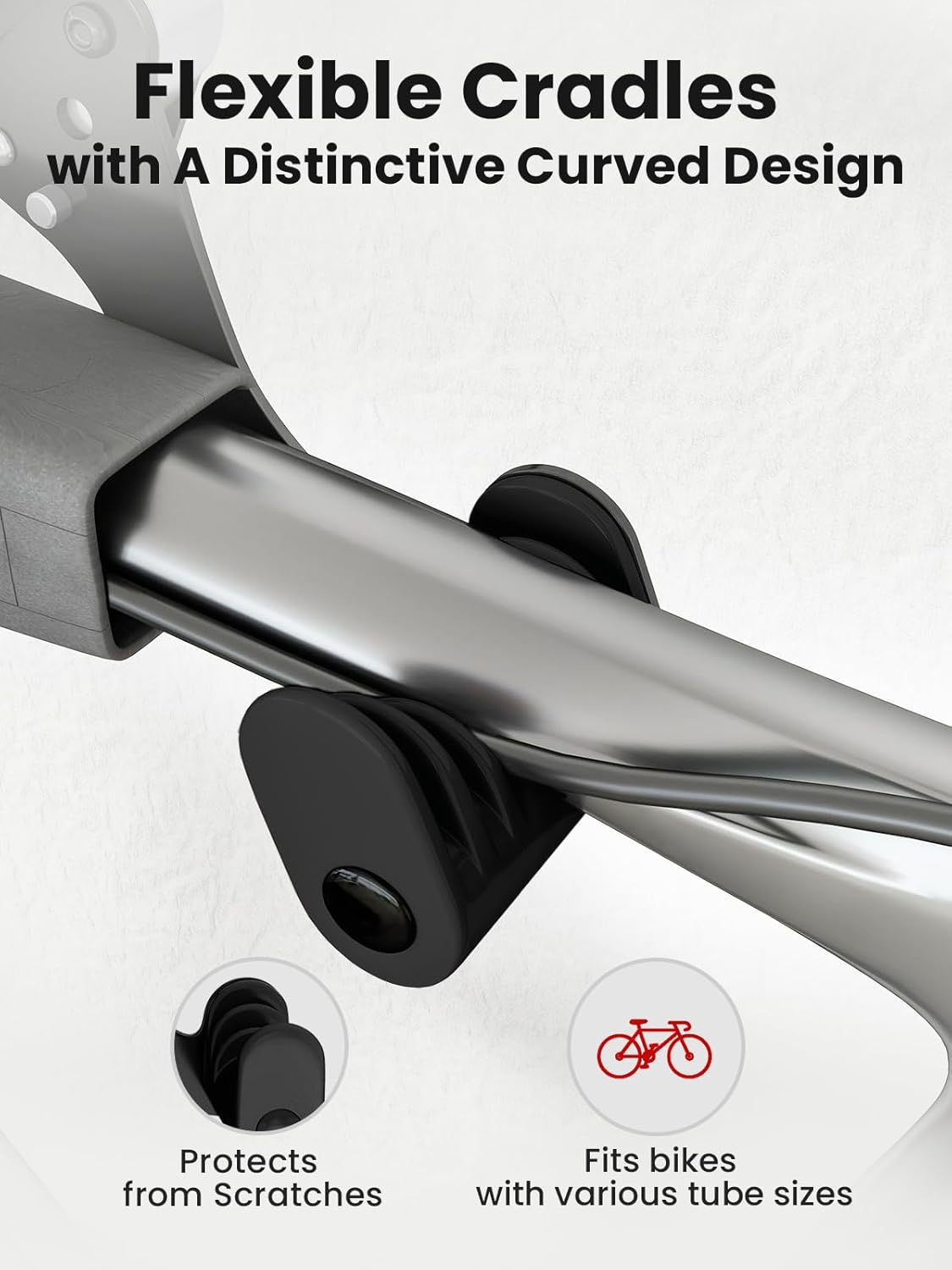 - Anti-Scratch & Secure Bike Holder - The flexible cradles with unique curved design protects your bike from scratches and paint damage. Additionally, the included front wheel stabilizing strap ensures your front wheel stays securely in place, preventing accidental contact with the wall in your apartment, garage, or home