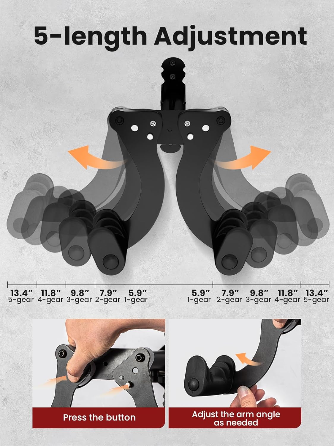 - Adjustable Bicycle Mount Wall - The hanger beam of bike wall storage adjusts in length from 13.8" to 17.7". To accommodate wider bicycles, the arm can extend to support handlebars up to 32.6" wide, making it an ideal space-saving solution for apartments, homes, garages, and carports